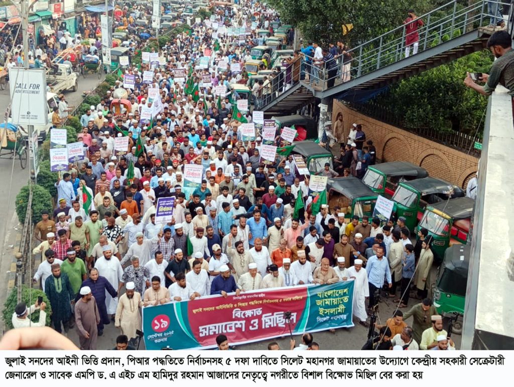 তিনি শুক্রবার (১৯ সেপ্টেম্বর) বিকেল সাড়ে ৩ টায় নগরীর রেজিস্ট্রারি মাঠে কেন্দ্র ঘোষিত বিক্ষোভ কর্মসূচীর অংশ হিসেবে জুলাই সনদের আইনী ভিত্তি প্রদান ও পিআর পদ্ধতিতে নির্বাচনসহ ৫ দফা দাবিতে সিলেট মহানগর জামায়াত আয়োজিত বিক্ষোভ সমাবেশে প্রধান অতিথির বক্তব্যে উপরোক্ত কথা বলেন। জামায়াতের কেন্দ্রীয় কর্মপরিষদ সদস্য ও সিলেট মহানগরী আমীর মুহাম্মদ ফখরুল ইসলামের সভাপতিত্বে, মহানগর নায়েবে আমীর ড. নূরুল ইসলাম বাবুল ও সেক্রেটারী মোহাম্মদ শাহজাহান আলীর যৌথ পরিচালনায় অনুষ্ঠিত বিক্ষোভ সমাবেশে বিশেষ অতিথির বক্তব্য রাখেন, জামায়াতের কেন্দ্রীয় মজলিসে শুরা সদস্য, সিলেট জেলা আমীর ও সিলেট-১ আসনে জামায়াত মনোনীত সংসদ সদস্য প্রার্থী মাওলানা হাবিবুর রহমান।