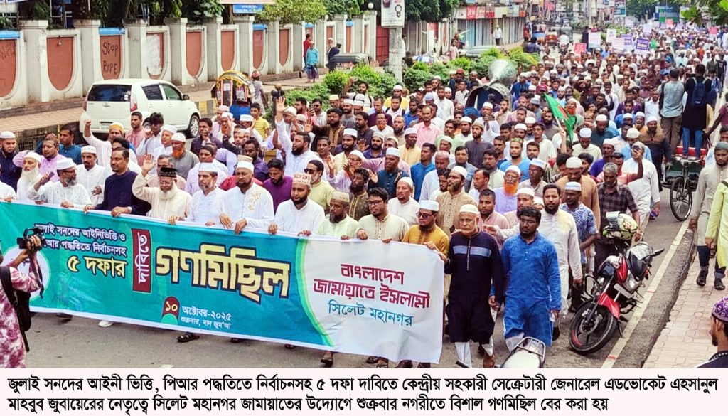তিনি শুক্রবার (১০ অক্টোবর) বাদ জুমআ নগরীর কোর্ট পয়েন্টে জামায়াত কেন্দ্র ঘোষিত বিক্ষোভ কর্মসূচীর অংশ হিসেবে সিলেট মহানগর জামায়াত আয়োজিত গণমিছিল পূর্ব সংক্ষিপ্ত সমাবেশে প্রধান অতিথির বক্তব্যে উপরোক্ত কথা বলেন। জুলাই সনদের আইনী ভিত্তি, পিআর পদ্ধতিতে নির্বাচনসহ ৫ দফা দাবিতে বিক্ষোভ সমাবেশ শেষে কোর্টপয়েন্ট থেকে বিশাল গণমিছিল বের করা হয়। মিছিলটি নগরীর গুরুত্বপূর্ণ পয়েন্টর প্রদক্ষিণ করে চৌহাট্টা পয়েন্টে গিয়ে সমাপ্ত হয়। মিছিলে সিলেট মহানগর ও বিভিন্ন থানা-ওয়ার্ড-ইউনিটের হাজার হাজার জনশক্তি অংশ নেন।