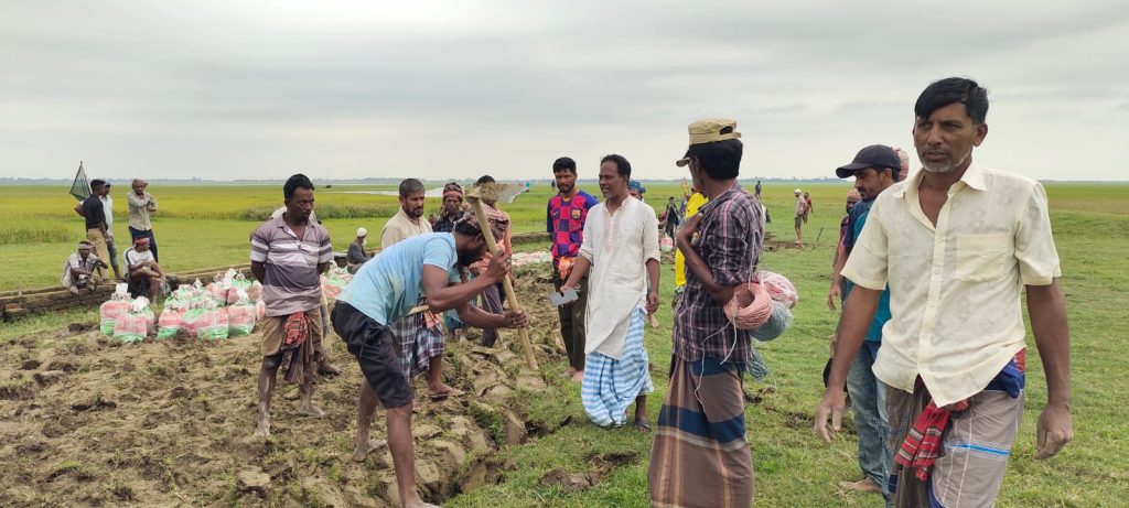 পড়ে স্হানীয় কৃষক এলাবাসী ও জনপ্রতিনিধিসহ সর্বস্তরের প্রায় ৫.শতাধিক মানুষ স্বেচ্ছাশ্রমে মাটি কেটে বস্তা দিয়ে বাঁধ দেন।