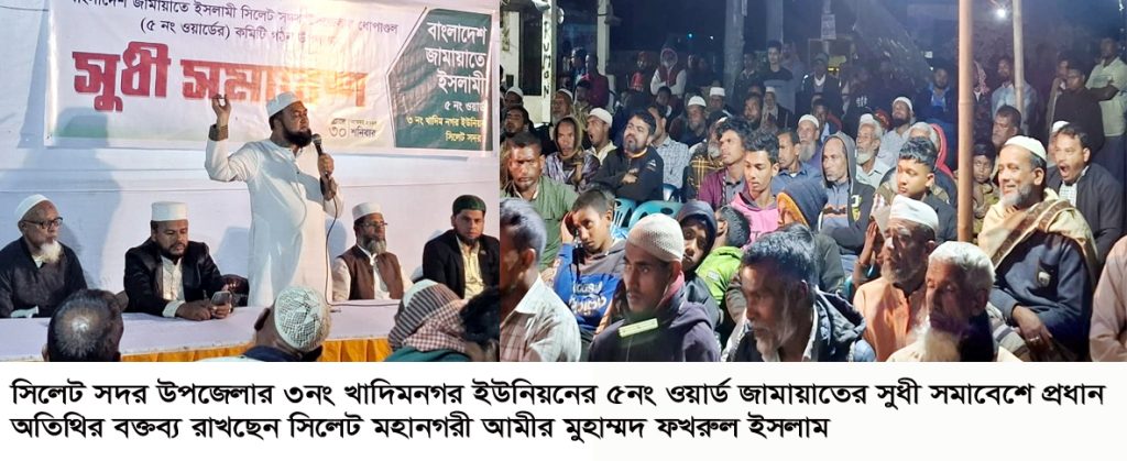 তিনি শনিবার (৩০ নভেম্বর) রাতে সিলেট সদর উপজেলার ৩নং খাদিমনগর ইউনিয়নের ৫নং ওয়ার্ড জামায়াত আয়োজিত সুধী সমাবেশে প্রধান অতিথির বক্তব্যে উপরোক্ত কথা বলেন। ওয়ার্ডের বিশিষ্ট মুরব্বি মুহিবুর রহমান সুলাইমানের সভাপতিত্বে ও ইউনিয়ন জামায়াতের সহকারি সেক্রেটারি নাইম আহমদের পরিচালনায় অনুষ্ঠিত সমাবেশে বিশেষ অতিথির বক্তব্য রাখেন মহানগর জামায়াতের সহকারী সেক্রেটারী মাওলানা ইসলাম উদ্দিন, সদর উপজেলা আমীর নাজির উদ্দিন, নায়েবে আমীর এডভোকেট মমিনুজ্জামান, খাদিমনগর ইউনিয়ন সভাপতি হেলাল আহমদ, নাজিম উদ্দিন ইমরান মেম্বার, ইউনিয়ন সেক্রেটারী গোলজার হোসেন নাজিম ও ছাত্রশিবির নেতা নাইম উদ্দিন প্রমুখ।